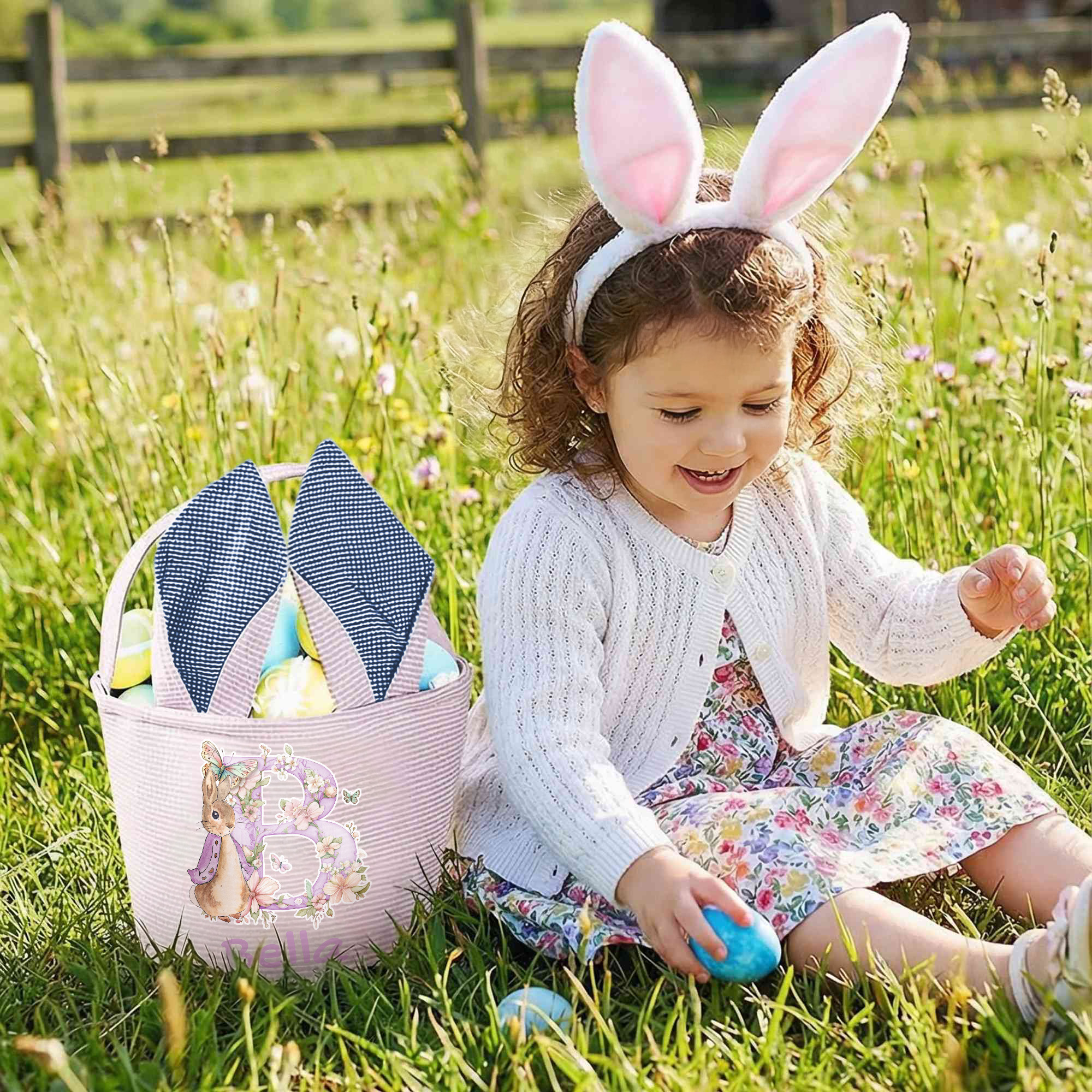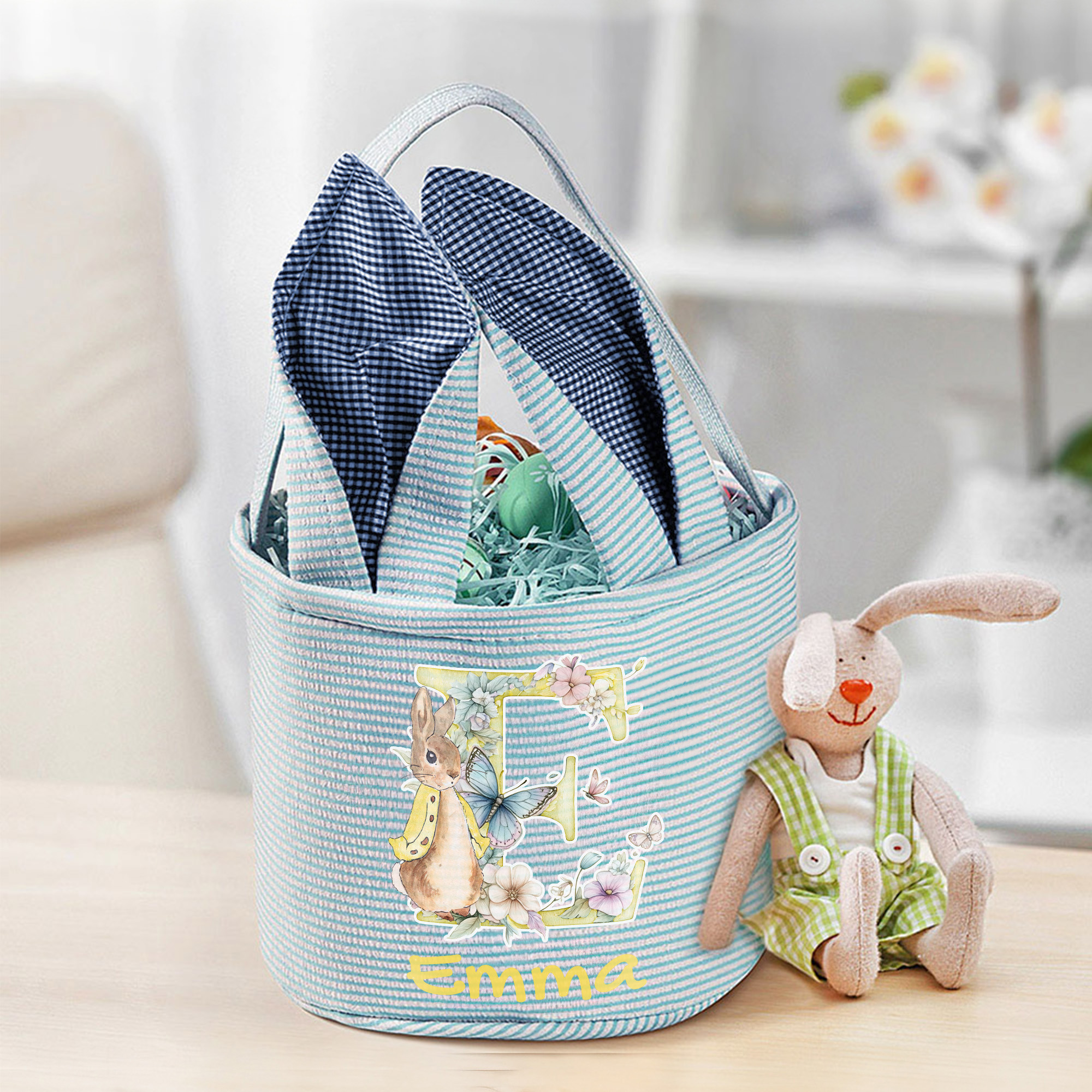 Custom Name Peter Rabbit Floral Alphabet Easter Basket with Bunny Ears |