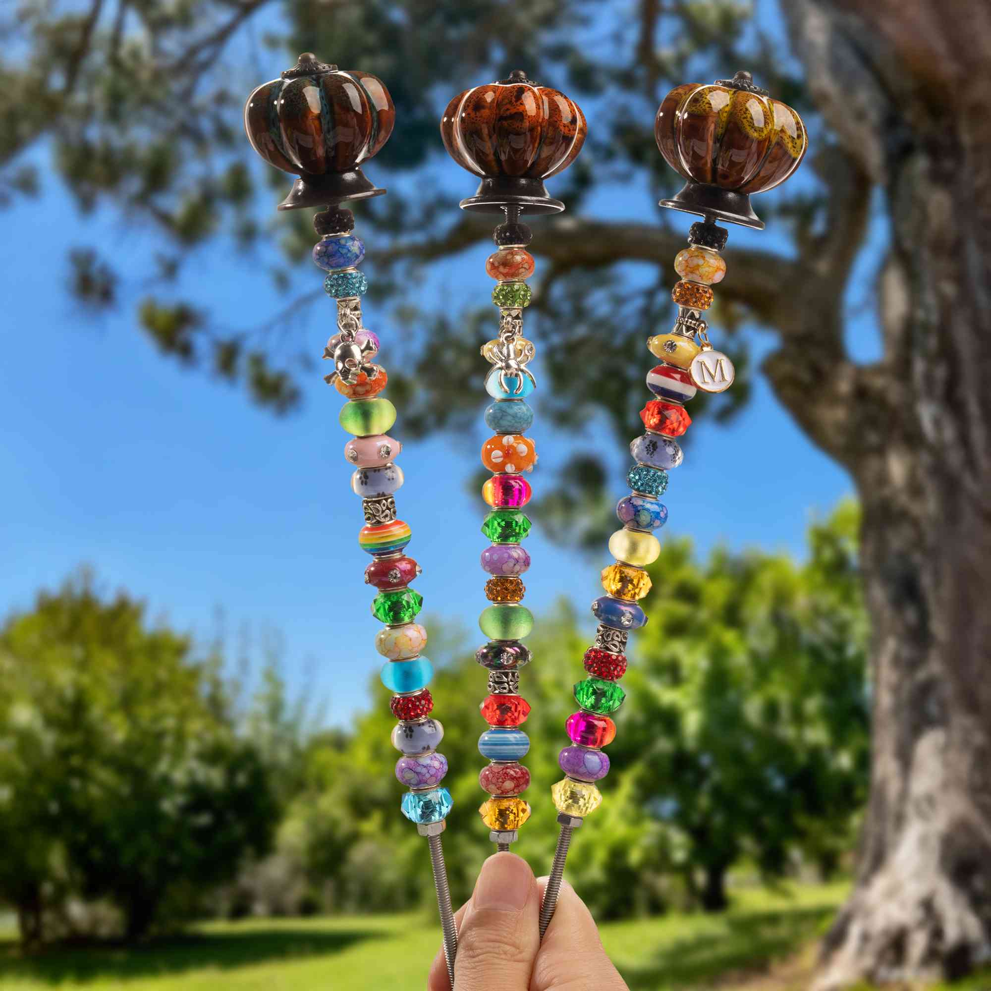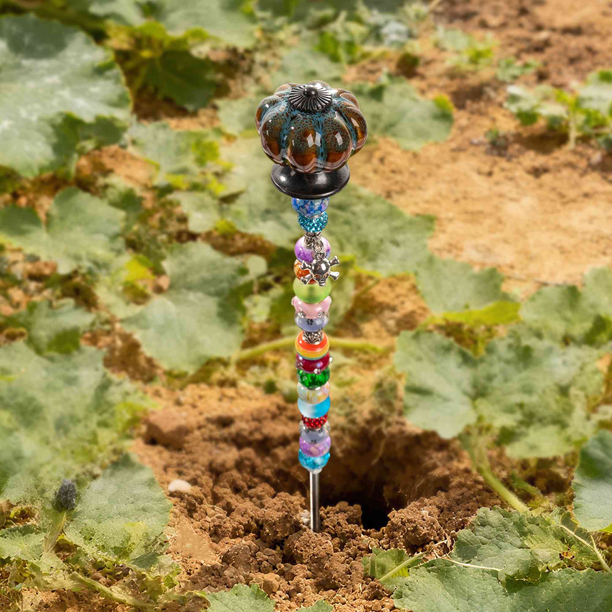 Stake: Stainless Steel; Pumpkin Top: Ceramic; Beads: Plastic |