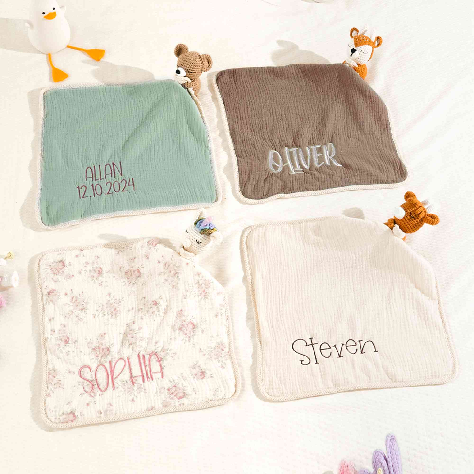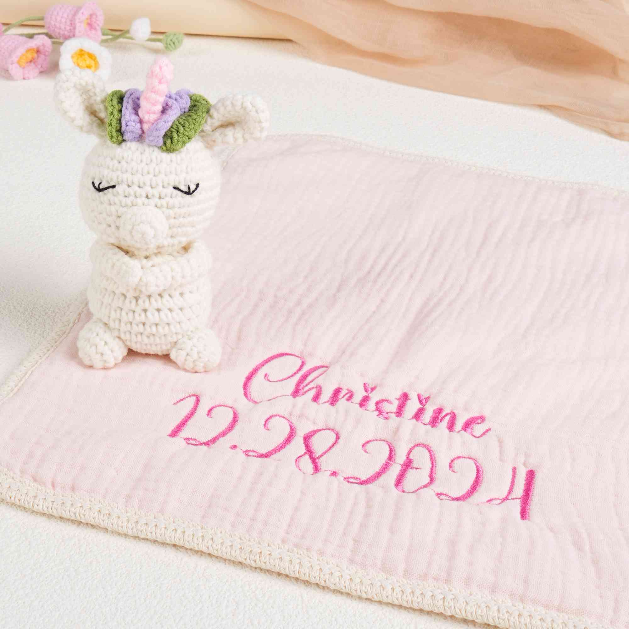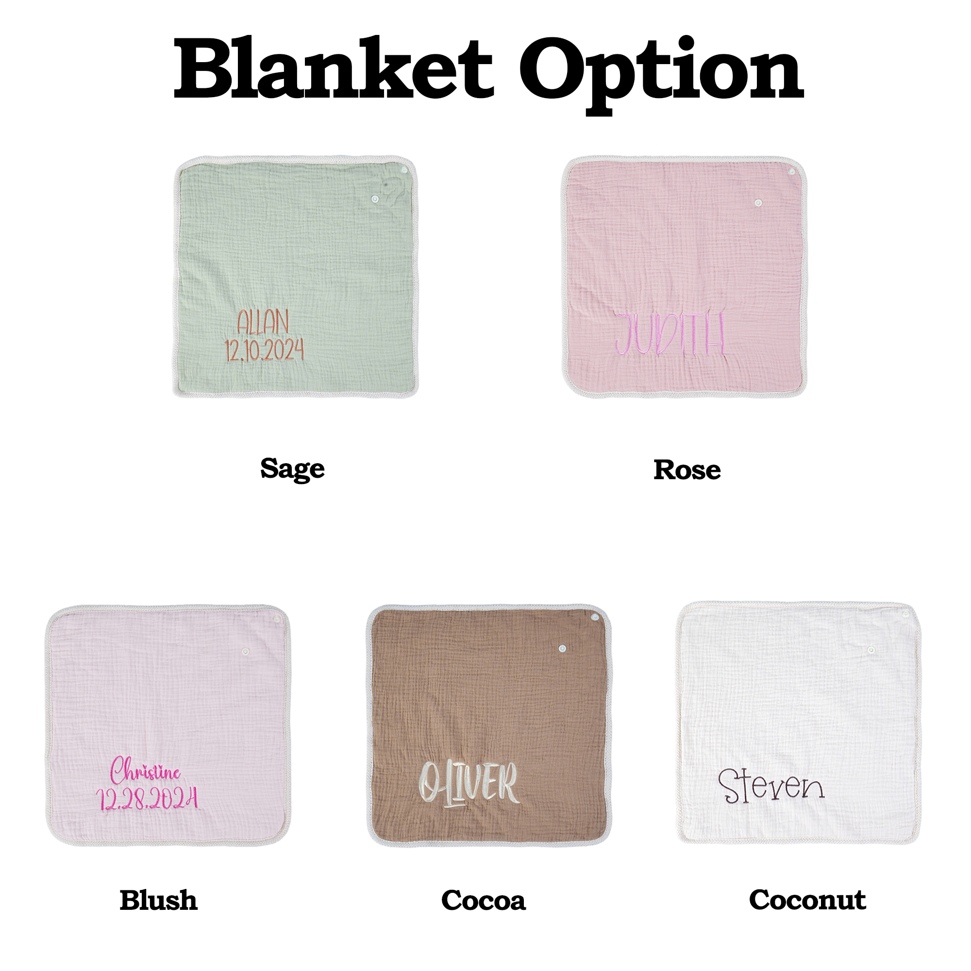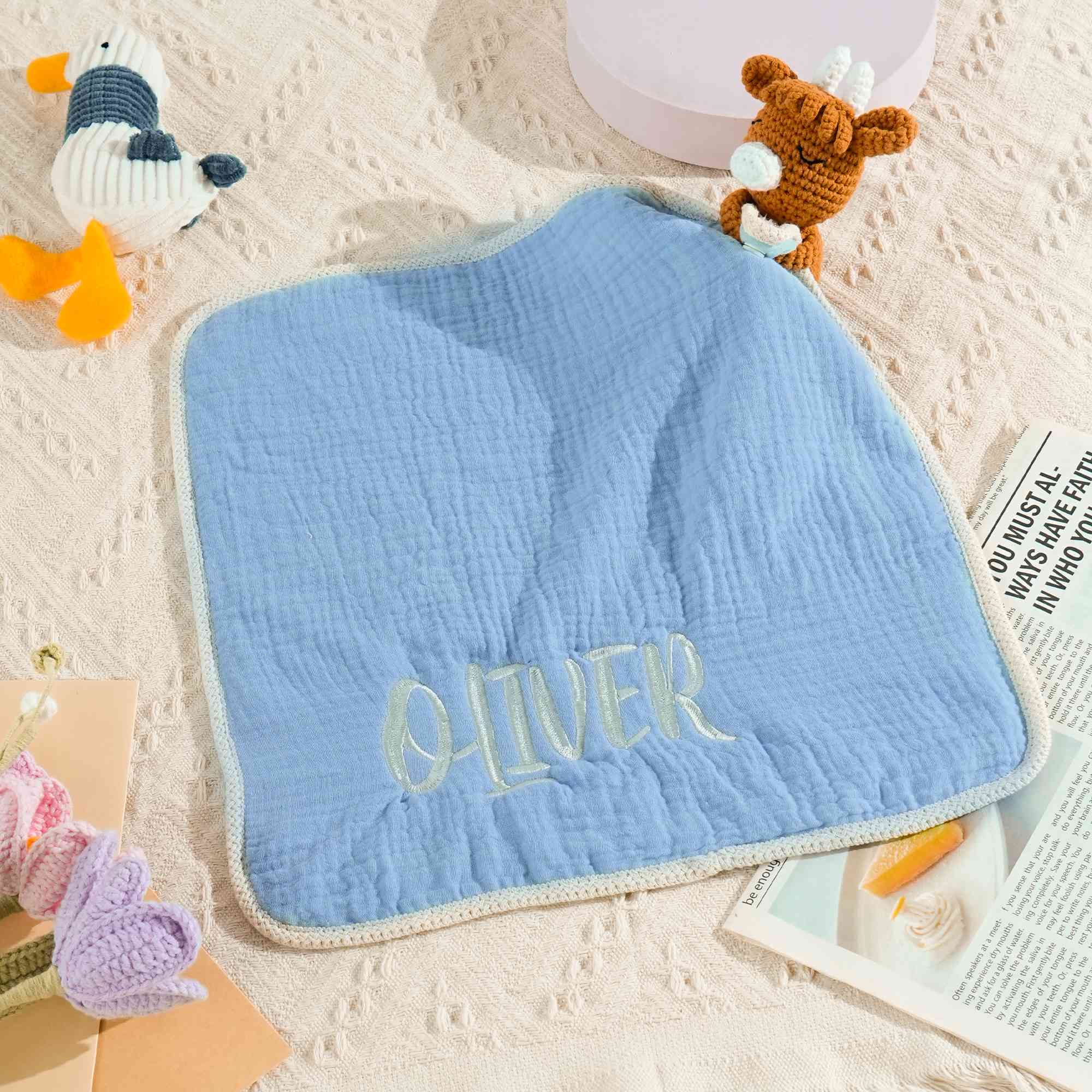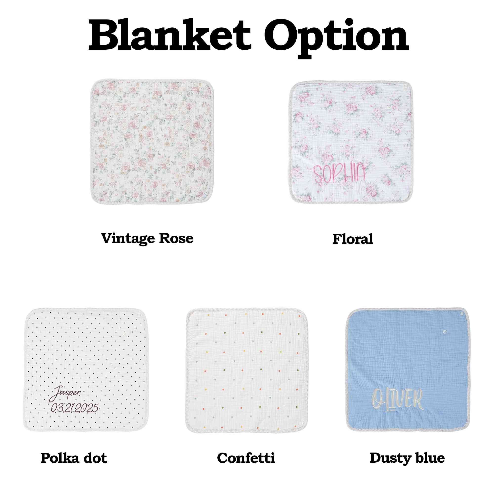 Personalized Baby’s Name - Add an embroidered name to create a one-of-a-kind keepsake. The personalization sits beautifully on the cloth, giving the blanket a warm, meaningful touch that parents love.